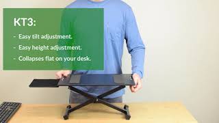 Kt3 overview - adjustable computer keyboard stand for standing raise keyboards to standing height Stand up and type comfortably with the ergonomic KT3 adjustable height and tilt computer keyboard stand. Rest KT3 on any desk and quickly raise keyboards to elbow-height plus type with a neutral or negative tilt. |
