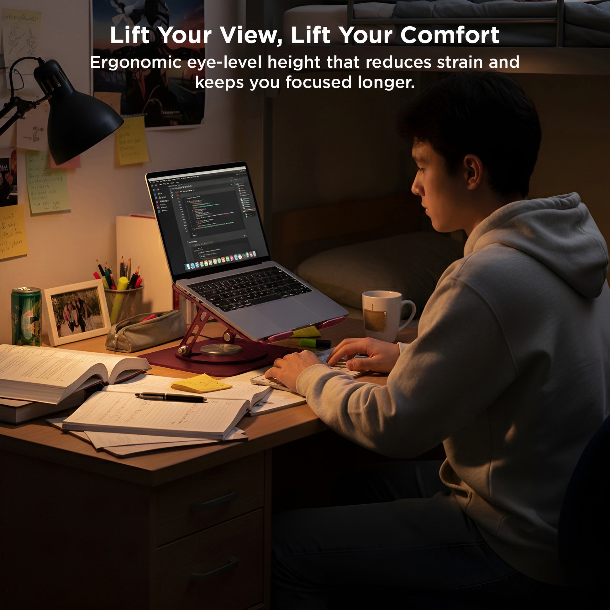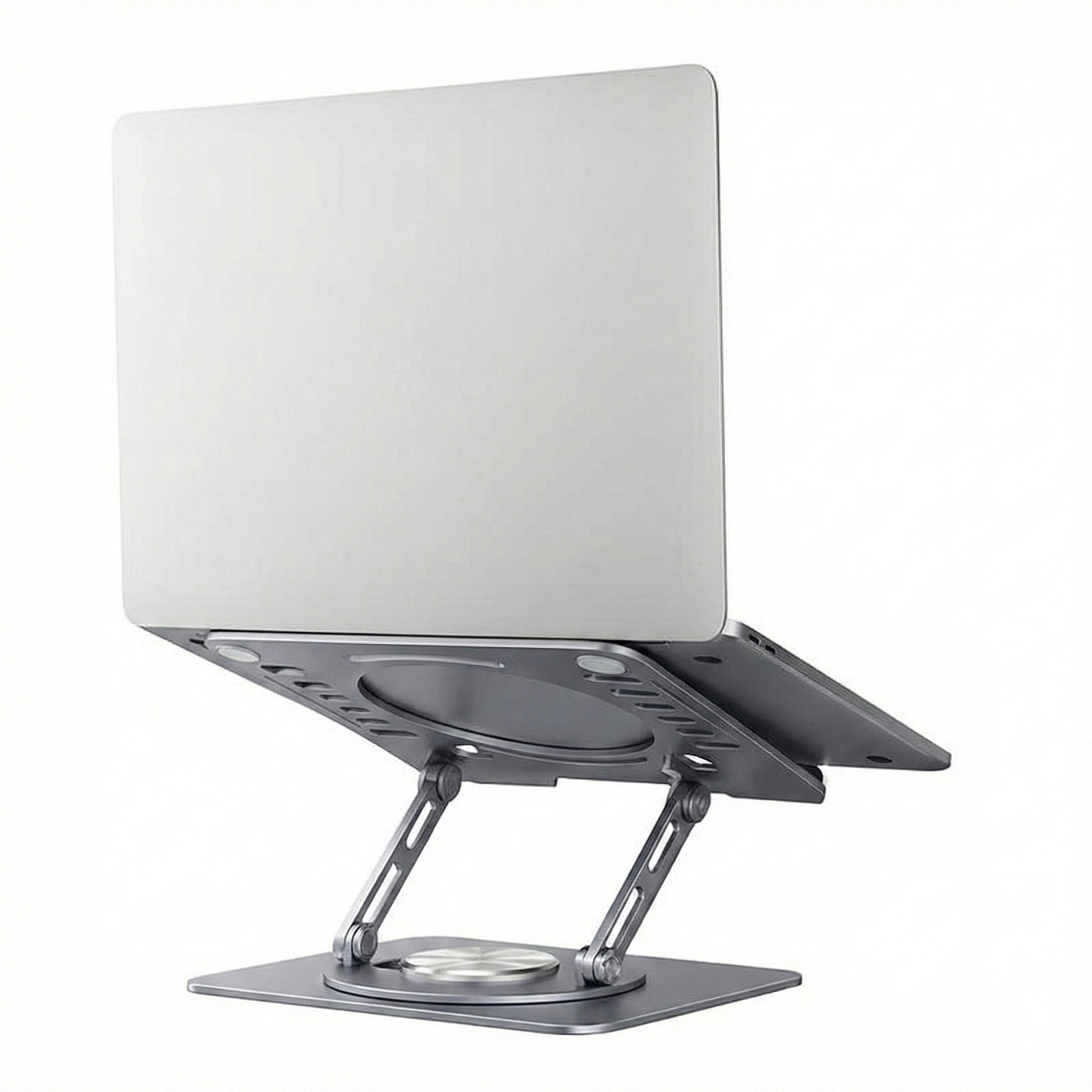 A simple Desktop stand that holds laptops in a more comfortable position. Raise, tilt, swivel, and cool laptops with this sturdy metal desktop riser.