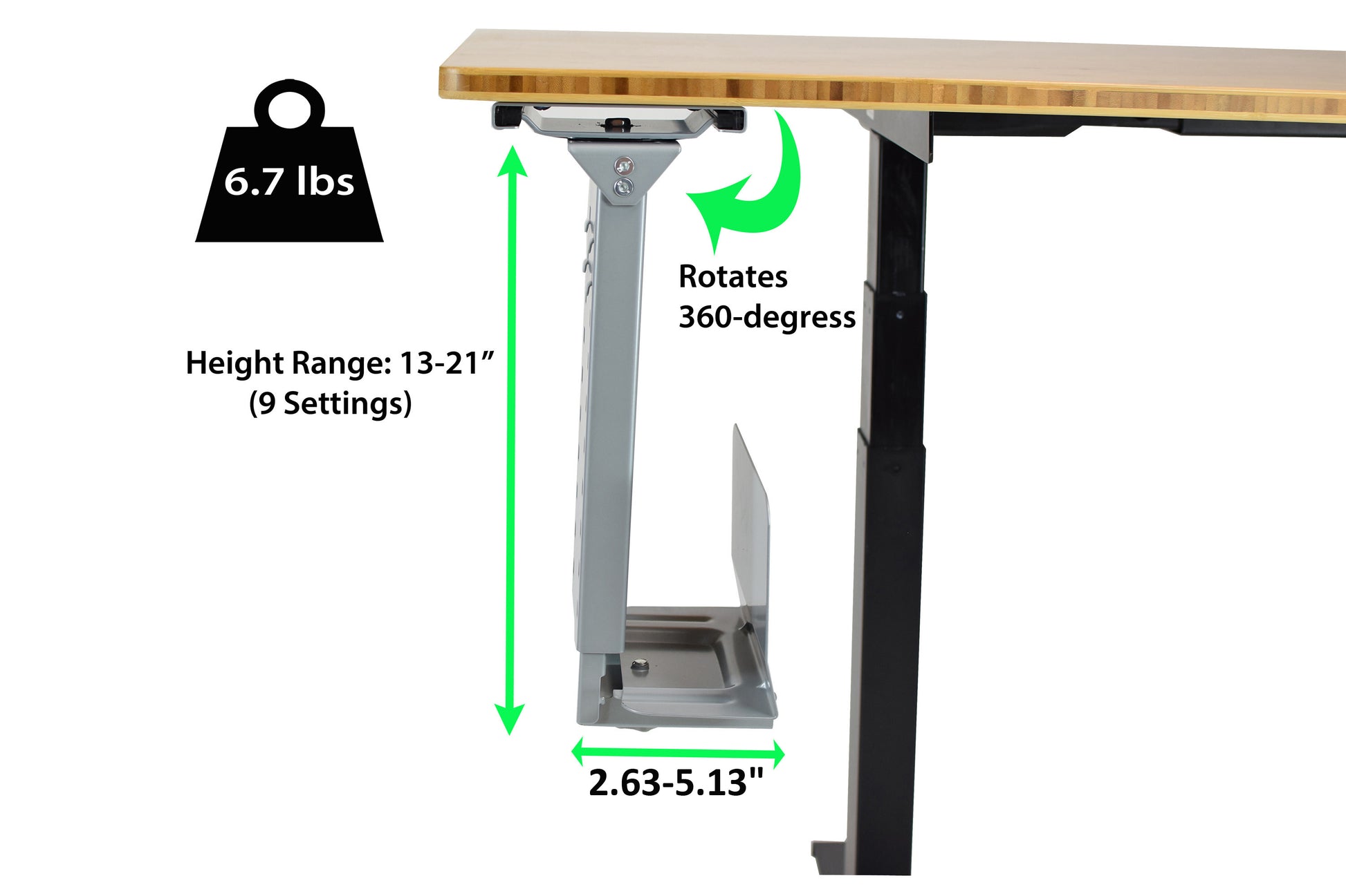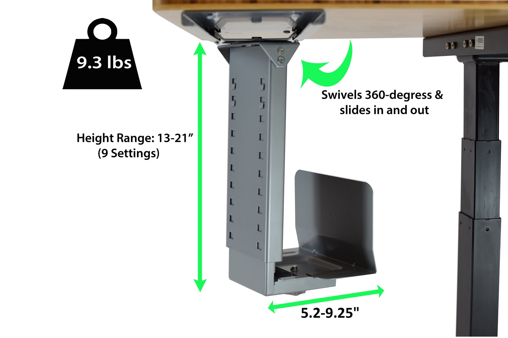 Cpu1g by uncaged ergonomics under desk cpu holder swivels 360 Improve desktop organization by conveniently storing computer CPUs under your desk with this durable, swiveling CPU Holder. This under desk CPU mount swivels 360 for easy access to ports and cables. Simple and intuitive height (13-21”) and width (3-5.75”) adjustments allow this cpu holder to securely hold a range of computer CPU sizes. This swiveling under-desk CPU holder is a must-have standing desk accessory that frees up desk-space and helps de-clutter your workspace. Built to commercial grade standards, this all-steel metal cpu holder quickly connects to virtually any wooden desktop via the secure 4-point mount. KEY FEAURES of this SWIVELING UNDER-DESK COMPUTER CPU HOLDER: 1. Quick 4-point mounting systems connect to any wooden desktop. 2. Swivels 360-degrees for easy access to all ports & cables. 3. Adjustable Height: to 9 settings from ~13-21" high. 4. Adjustable Width: from 3-5.75" |